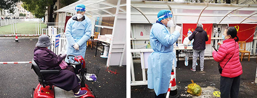 当天,另一支由赵胜红、唐朝组成的第三支志愿者小分队来到了明故宫苑社区的核酸检测点,认真细致地查验苏康码、提醒市民准备好身份证或身份码、维持检测点的秩序、引导保持间隔距离等工作。